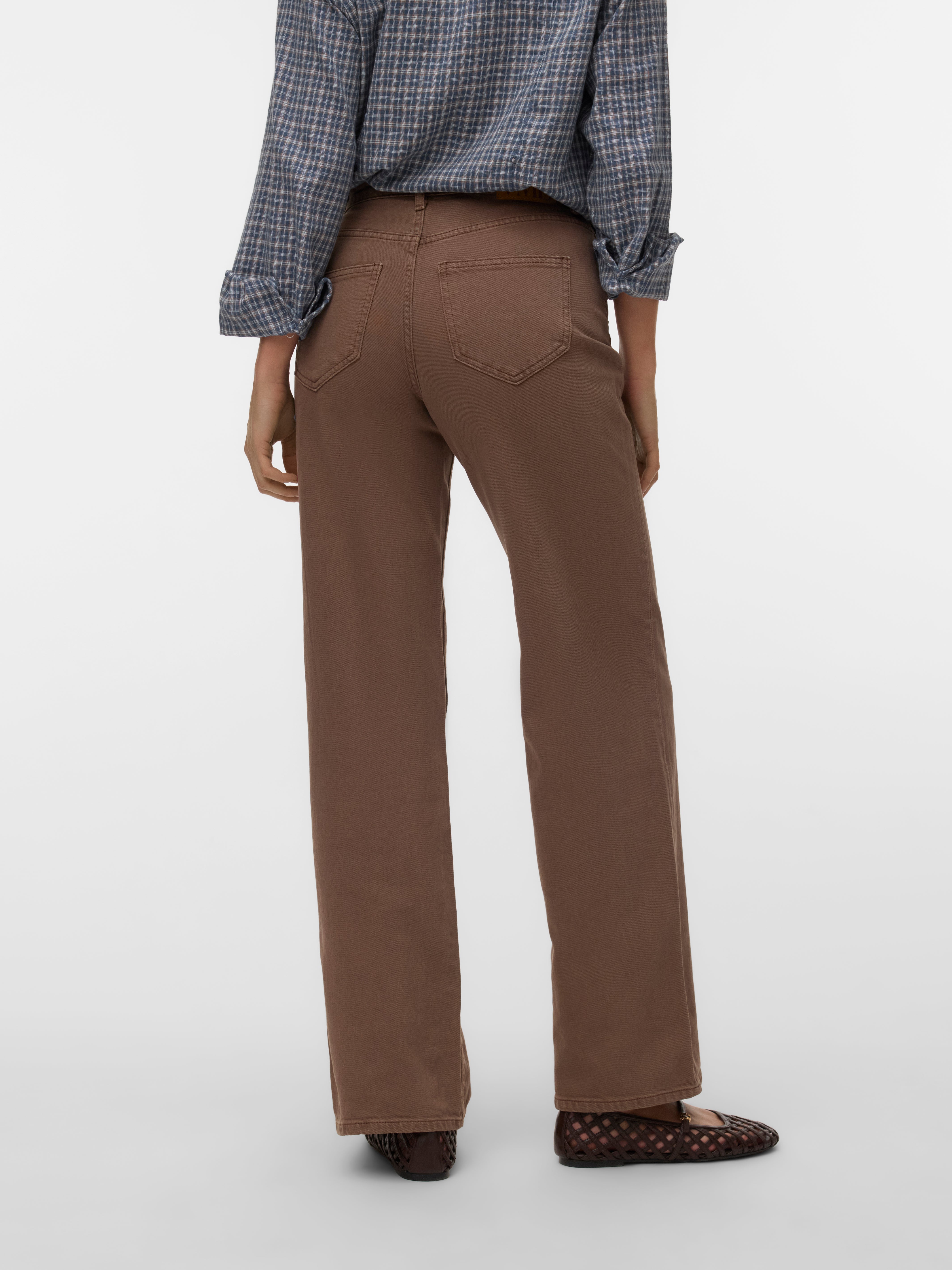 Disse brune jeans har en høj talje og en pasform med brede ben. De er designet med klassiske forlommer og baglommer samt en lukning med knap og lynlås.