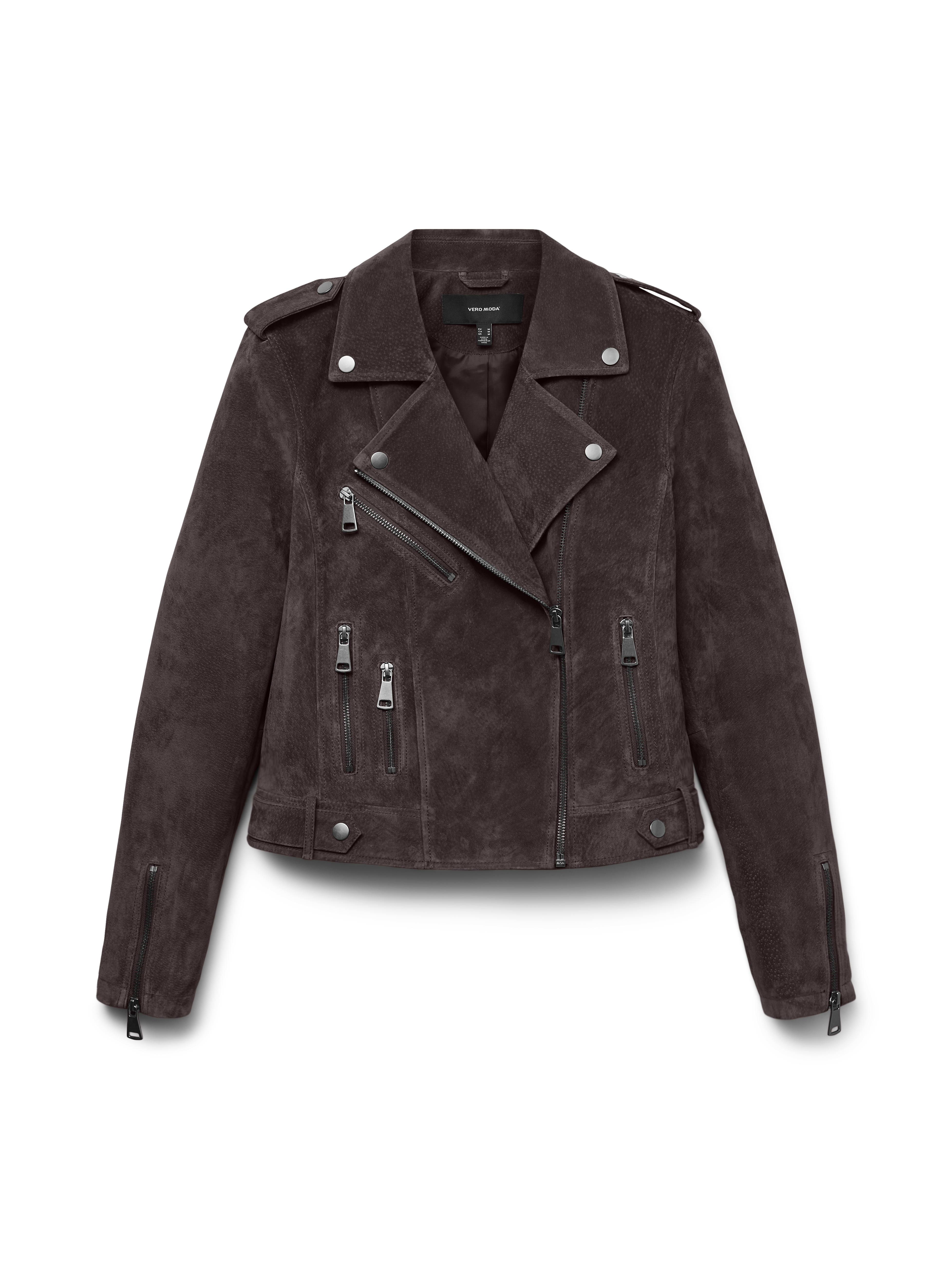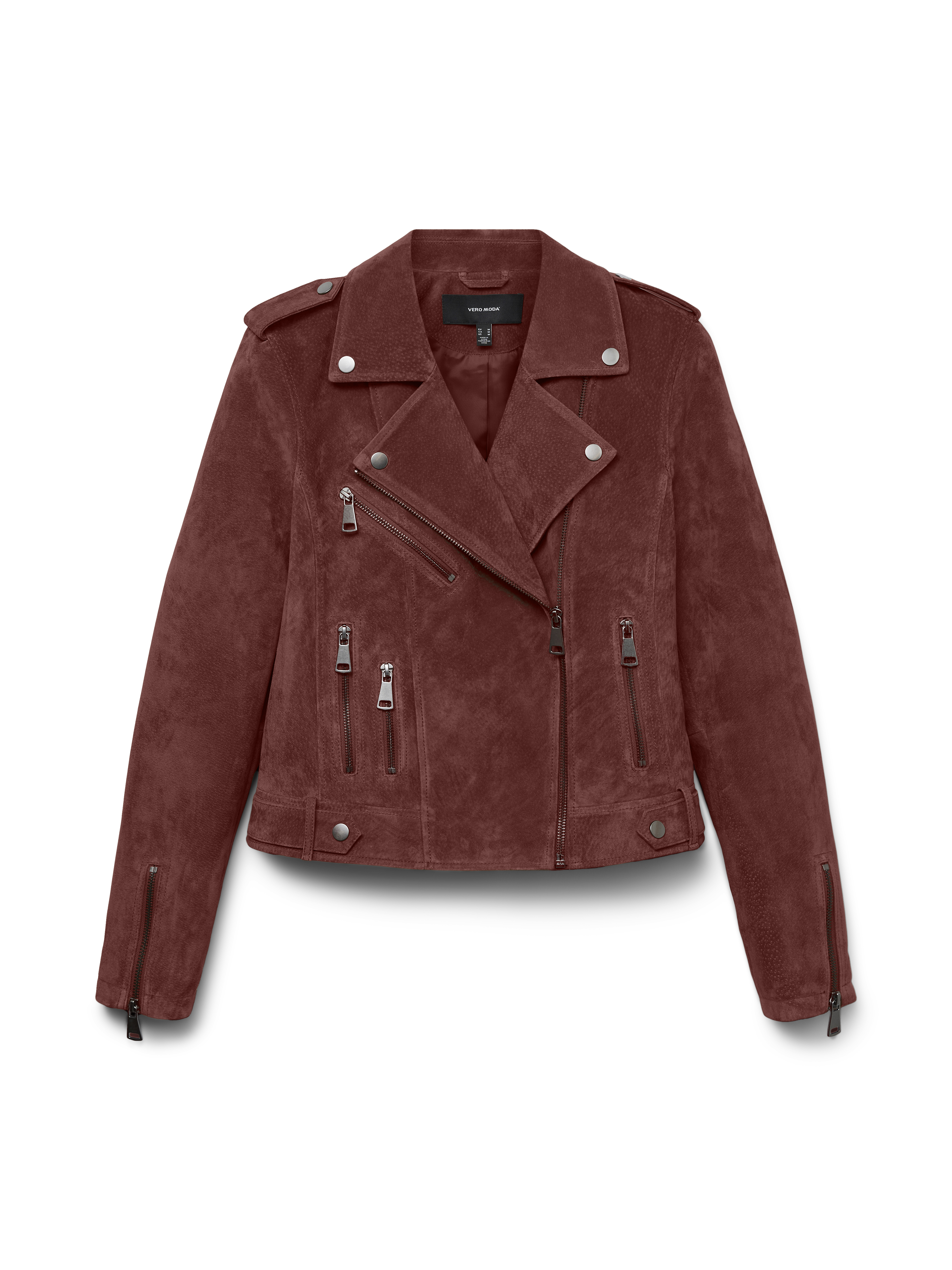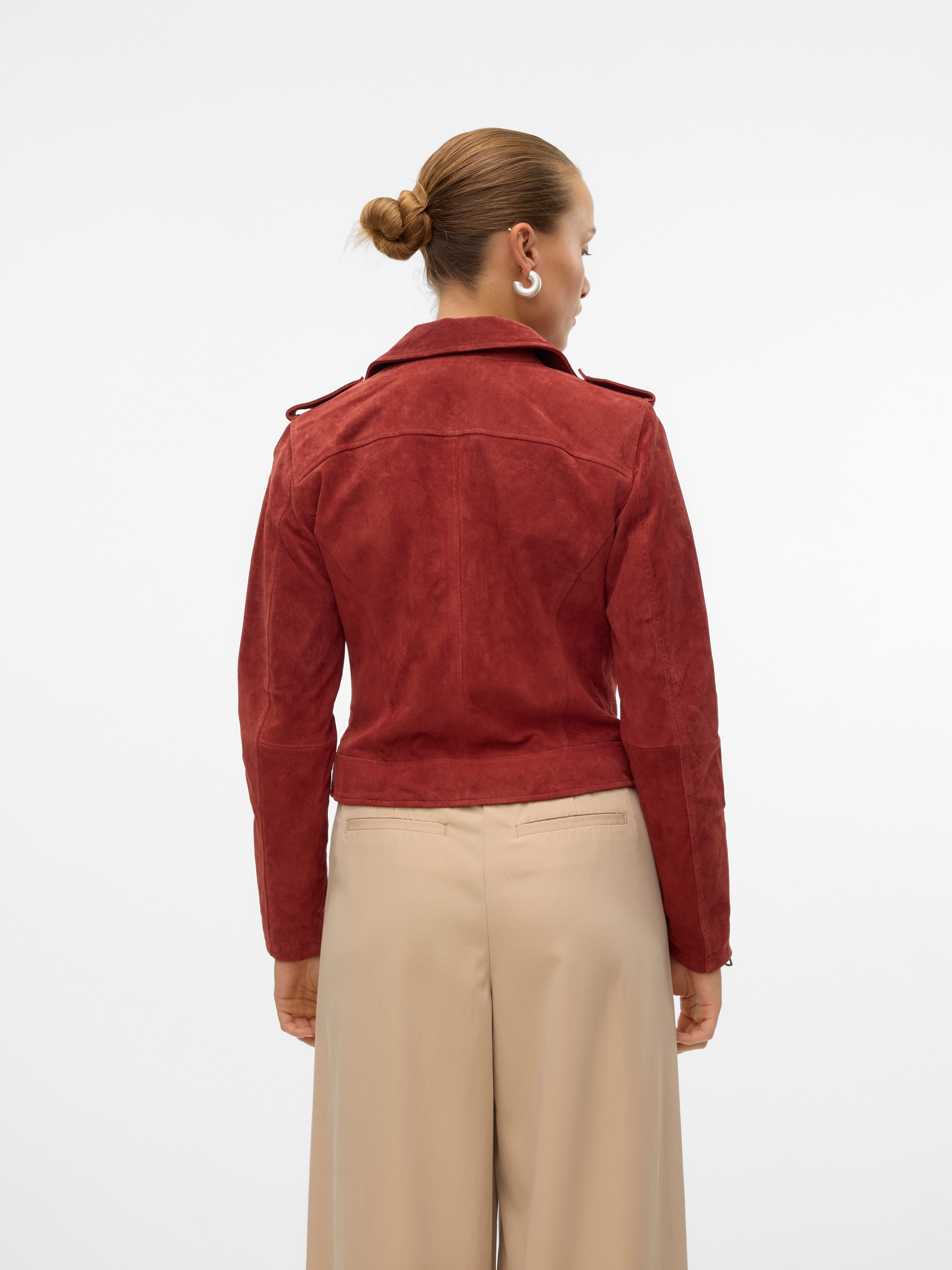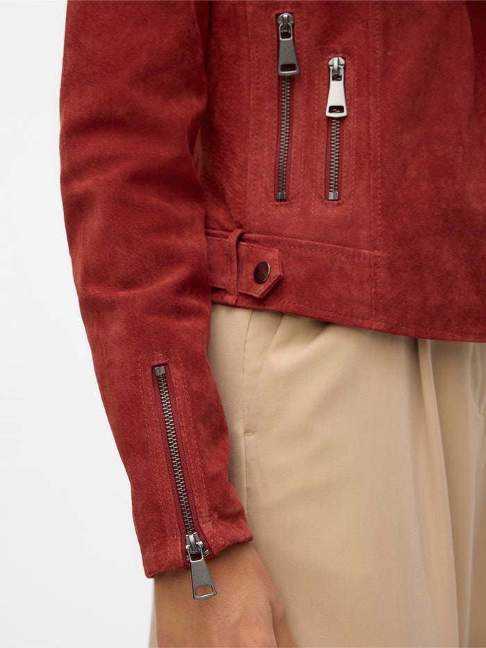En ensfarvet, rødbrun VMROYCEALICE ruskindsjakke med lange ærmer. Jakken har bikerkrave og lukkes med en asymmetrisk lynlås foran. Designet inkluderer forlommer med lynlås, lynlåsdetaljer ved ærmekanterne samt trykknapper og stropdetaljer ved skuldre og forneden. Jakken er fremstillet i 100% ruskind.