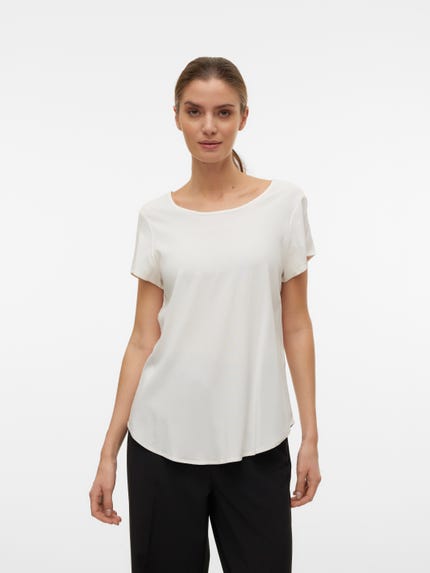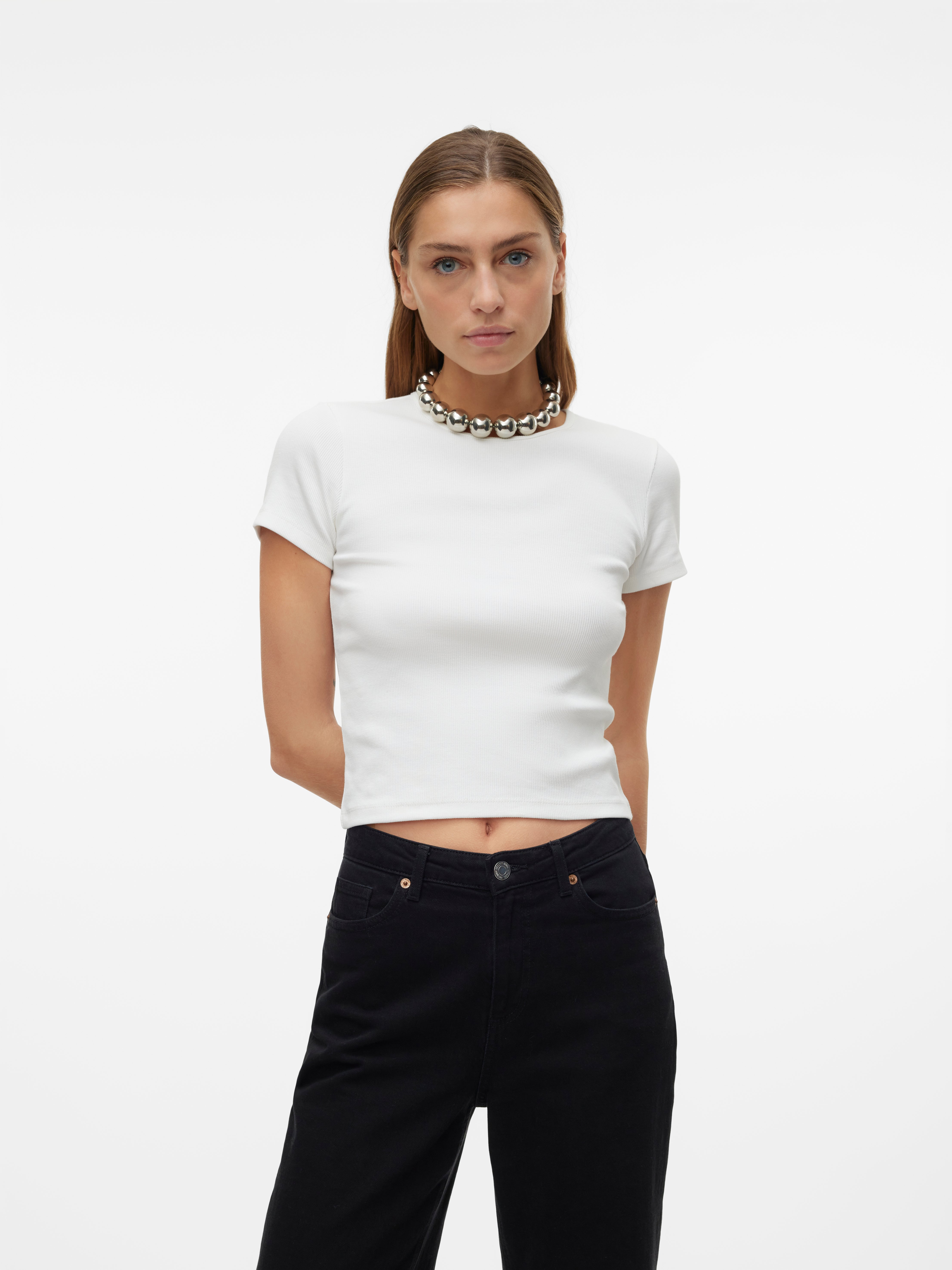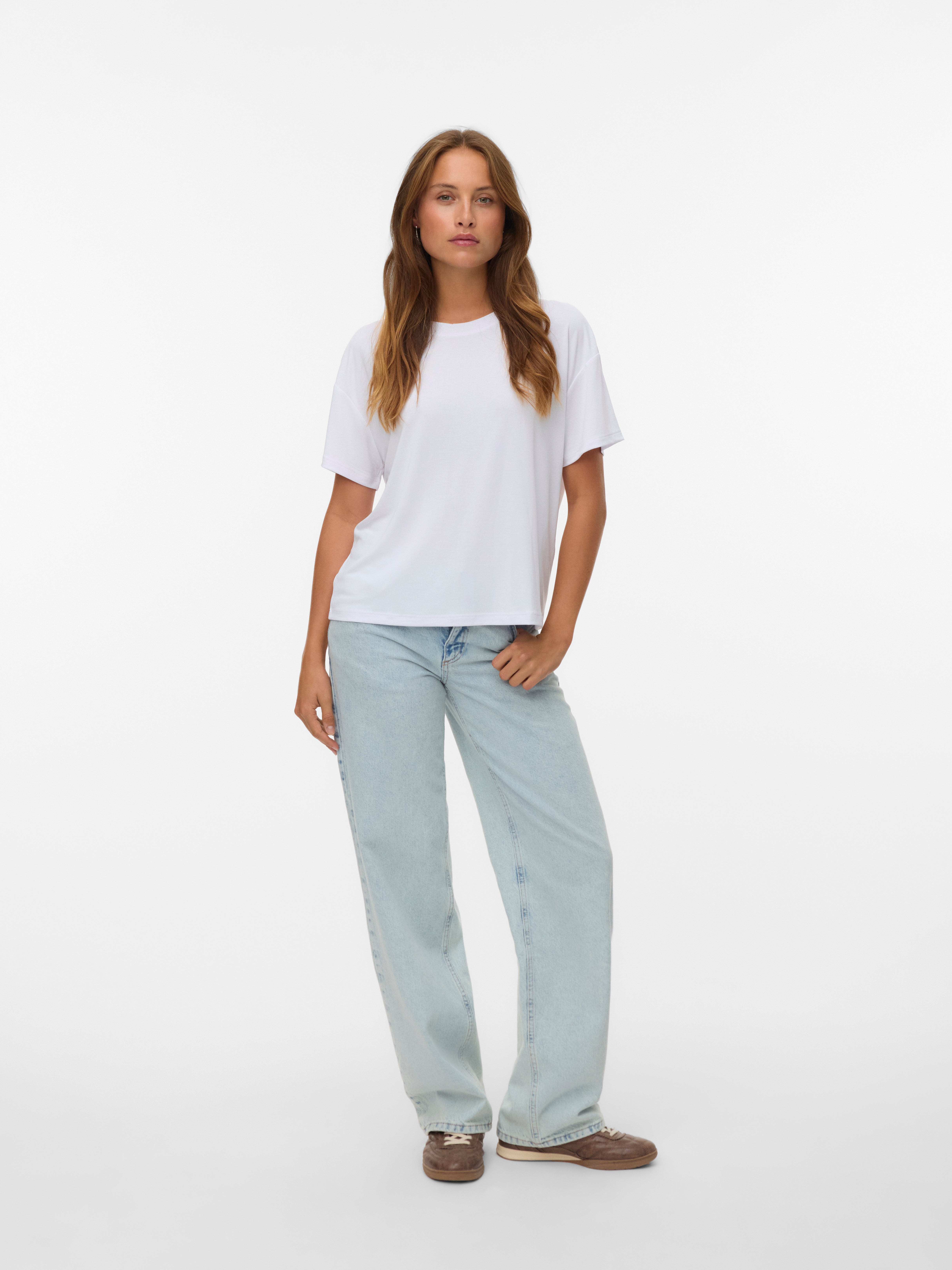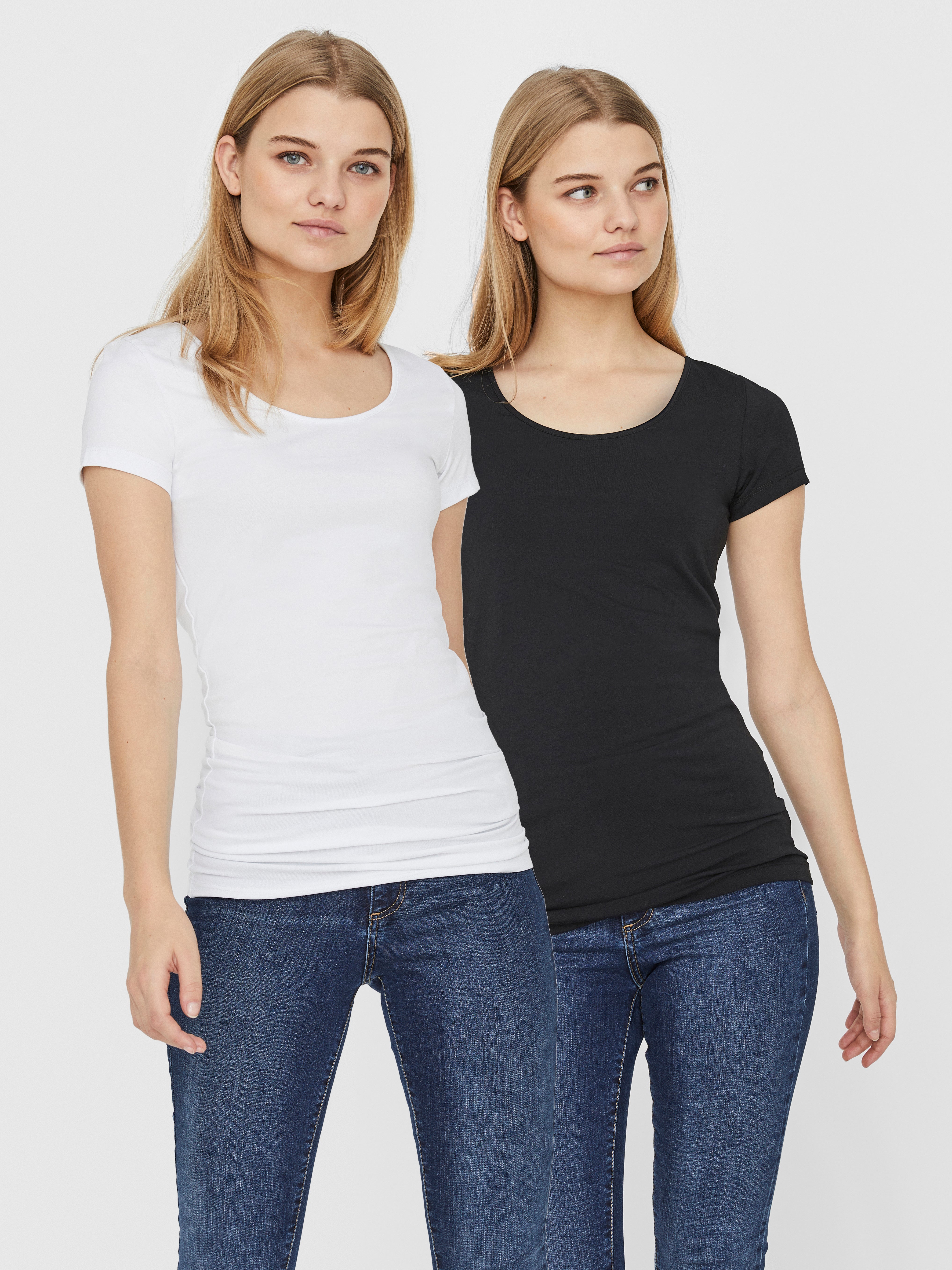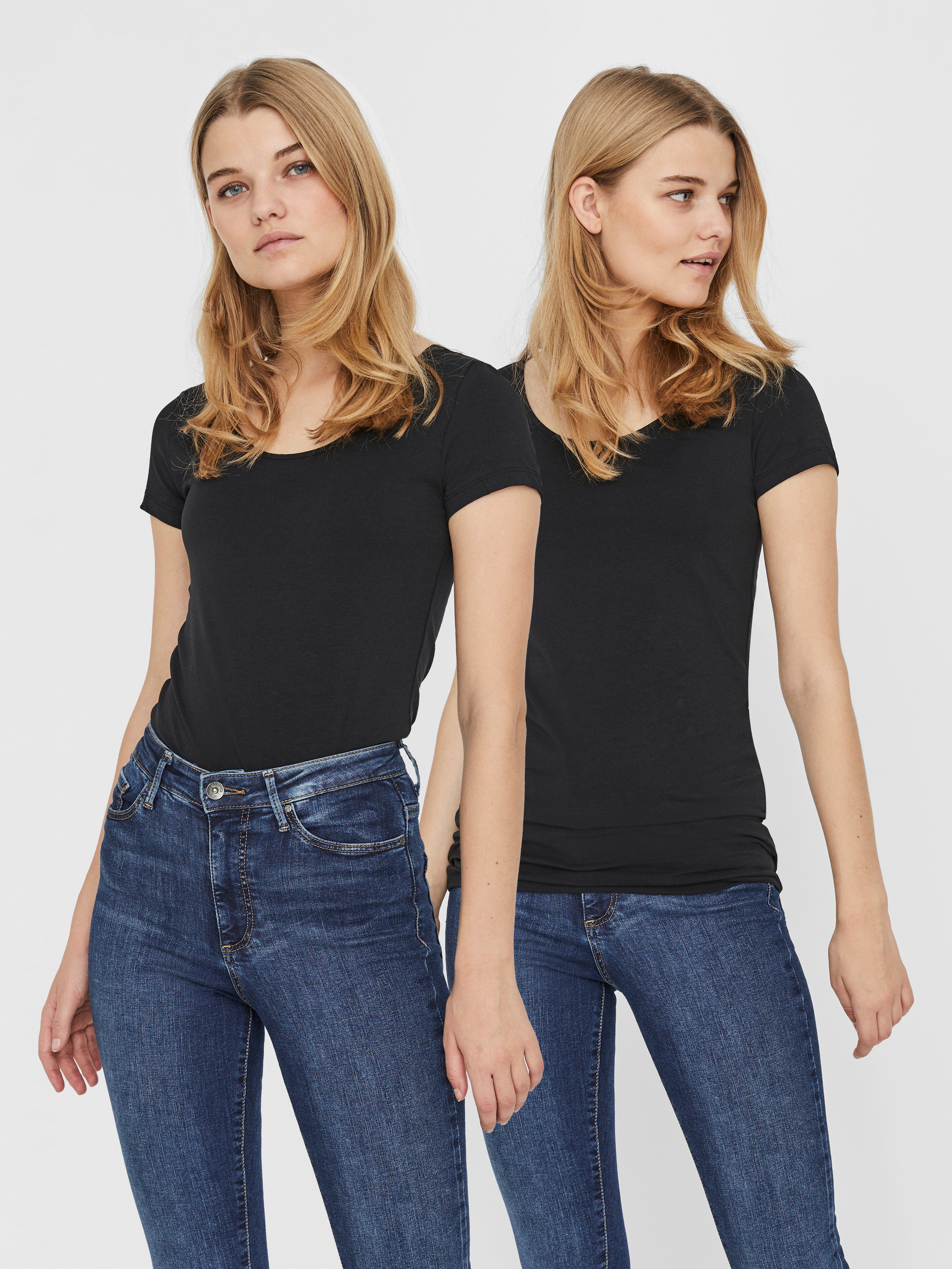colour of the dress to get the most complete outfit. Black, white grey or navy? Or just one of each? Make sure you have the blouses and tops in all the colours you need to complete the rest of your wardrobe. Basic T-shirts are not only reserved as a snug layer underneath your beautiful dresses and a jackets but can easily be integrated as a part of your entire outfit. If you're looking for new items to upgrade your closet, check out our stylish collection of women's jumpsuits. Choose a classic, white T-shirt. A wardrobe winner that never goes out of style. Match it with a pair of jeans and a cardigan to achieve a perfect and casual everyday look. Looking for something appropriate for business? Then opt for a black T-shirt. Styled with a matching blazer and a pair of boots, this makes the ultimate, monochrome power suit. Basic tops are undoubtedly must have in women’s wardrobe so make sure you have all you need by shopping online at VERO MODA now.