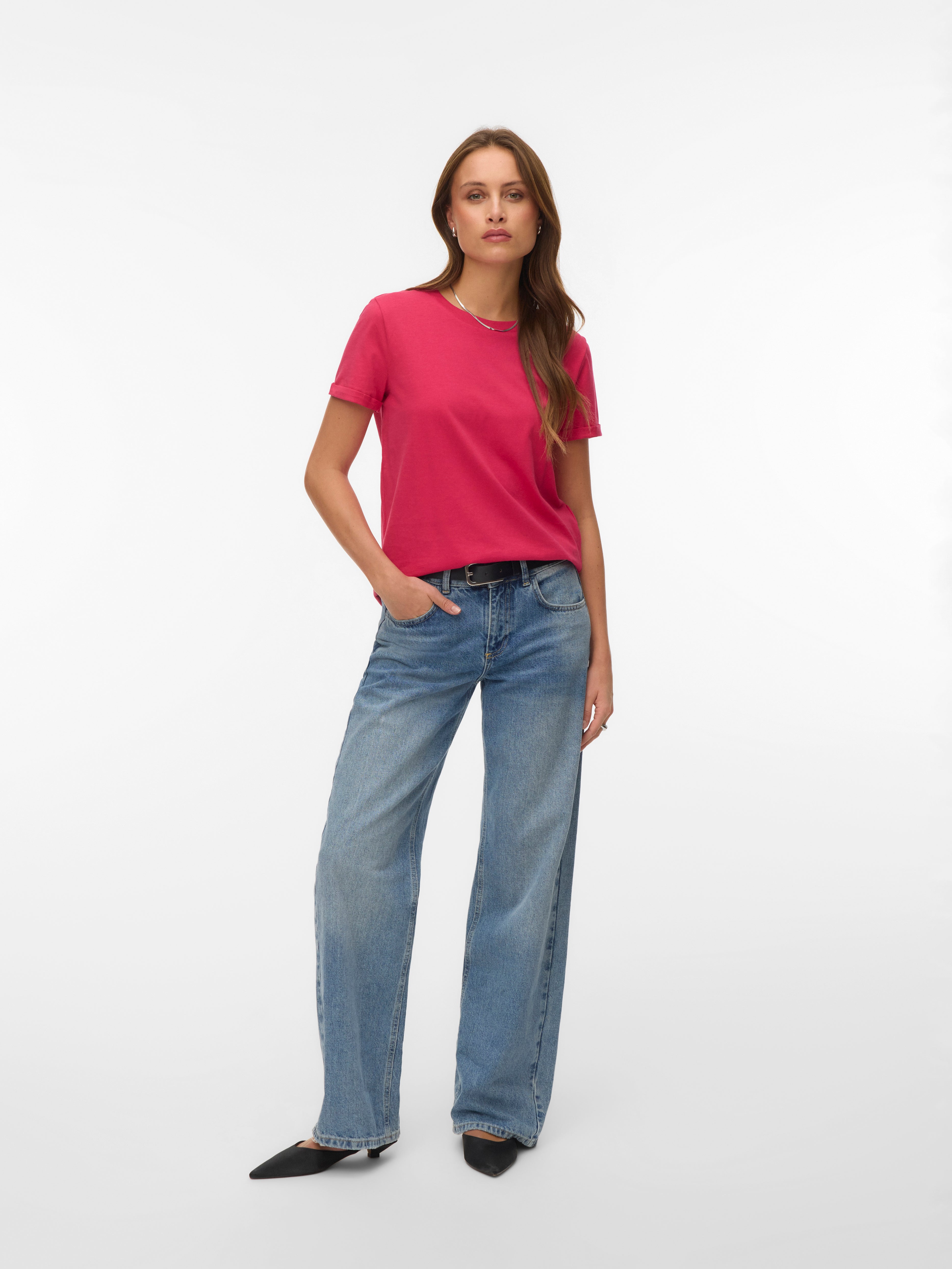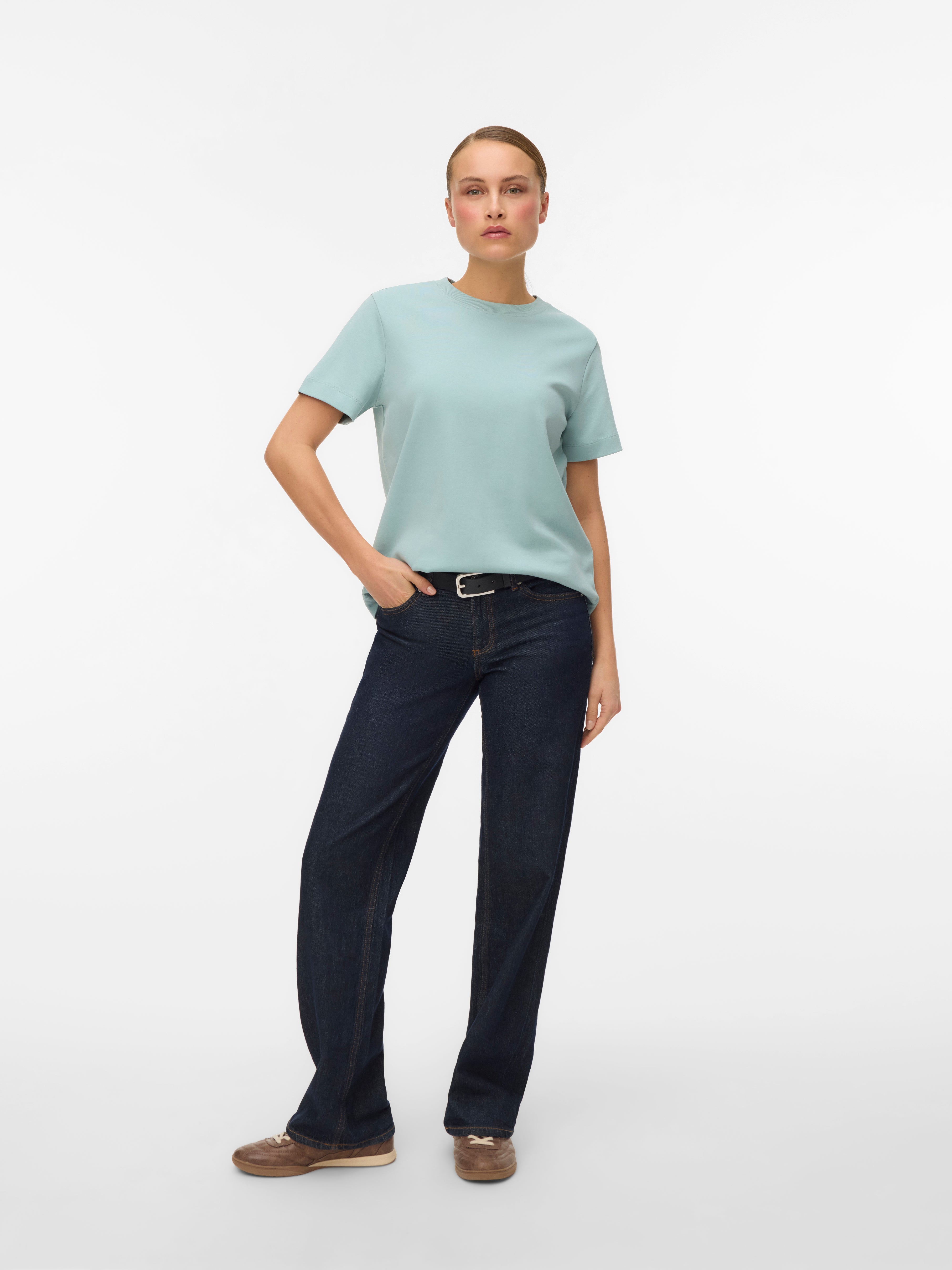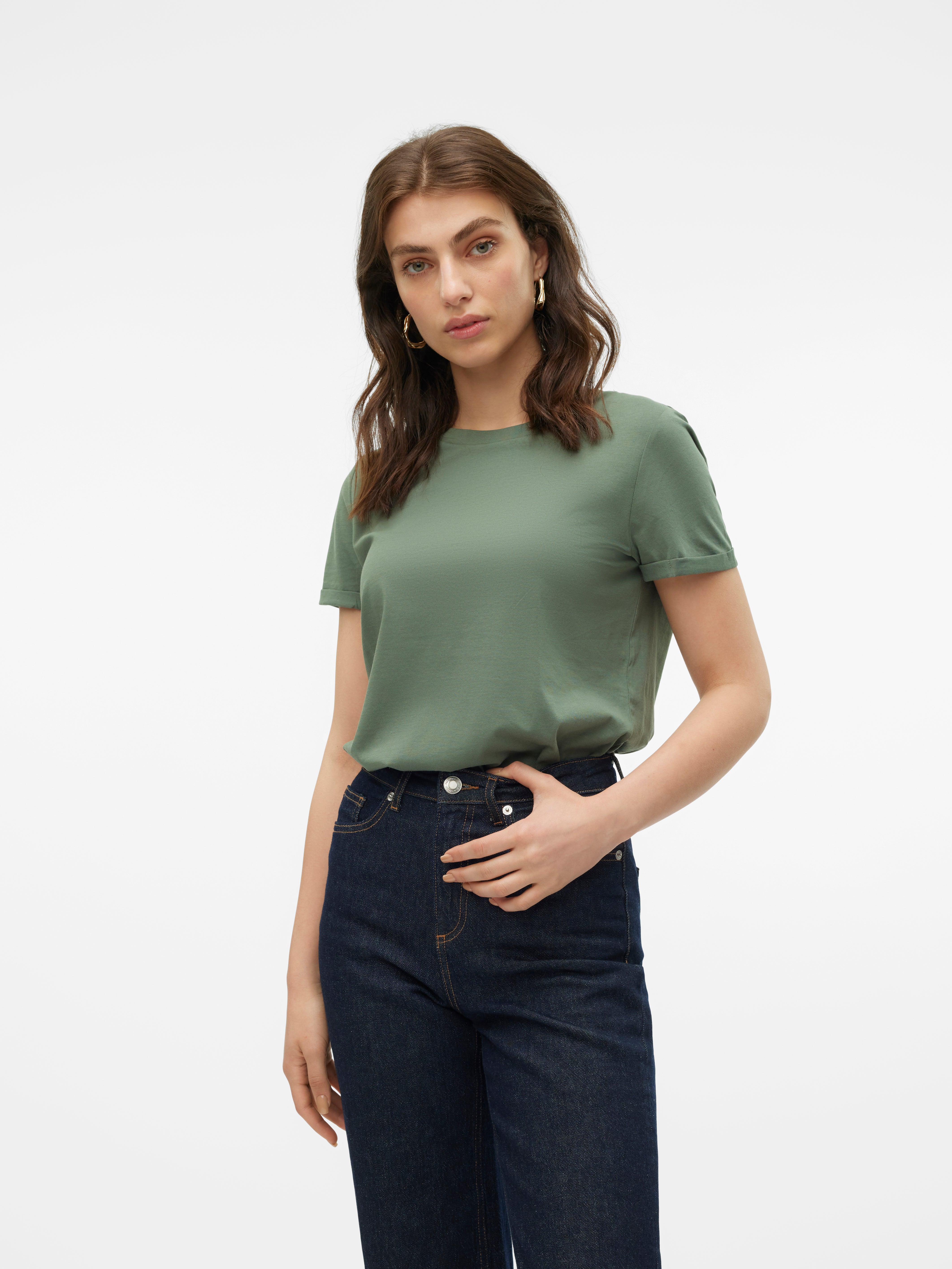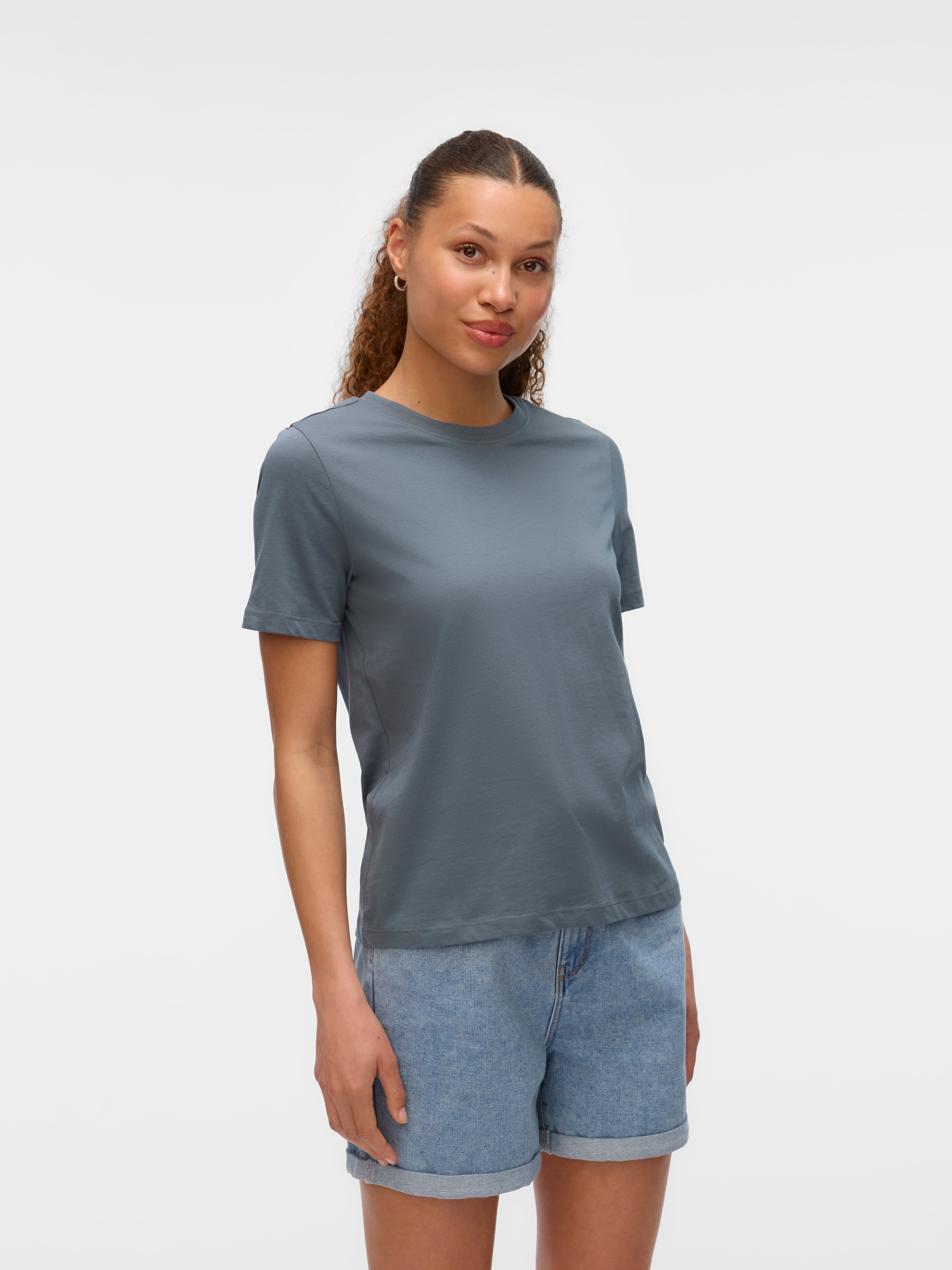 colour of the dress to get the most complete outfit. Black, white grey or navy? Or just one of each? Make sure you have the blouses and tops in all the colours you need to complete the rest of your wardrobe. Basic T-shirts are not only reserved as a snug layer underneath your beautiful dresses and a jackets but can easily be integrated as a part of your entire outfit. If you're looking for new items to upgrade your closet, check out our stylish collection of women's jumpsuits. Choose a classic, white T-shirt. A wardrobe winner that never goes out of style. Match it with a pair of jeans and a cardigan to achieve a perfect and casual everyday look. Looking for something appropriate for business? Then opt for a black T-shirt. Styled with a matching blazer and a pair of boots, this makes the ultimate, monochrome power suit. Basic tops are undoubtedly must have in women’s wardrobe so make sure you have all you need by shopping online at VERO MODA now.