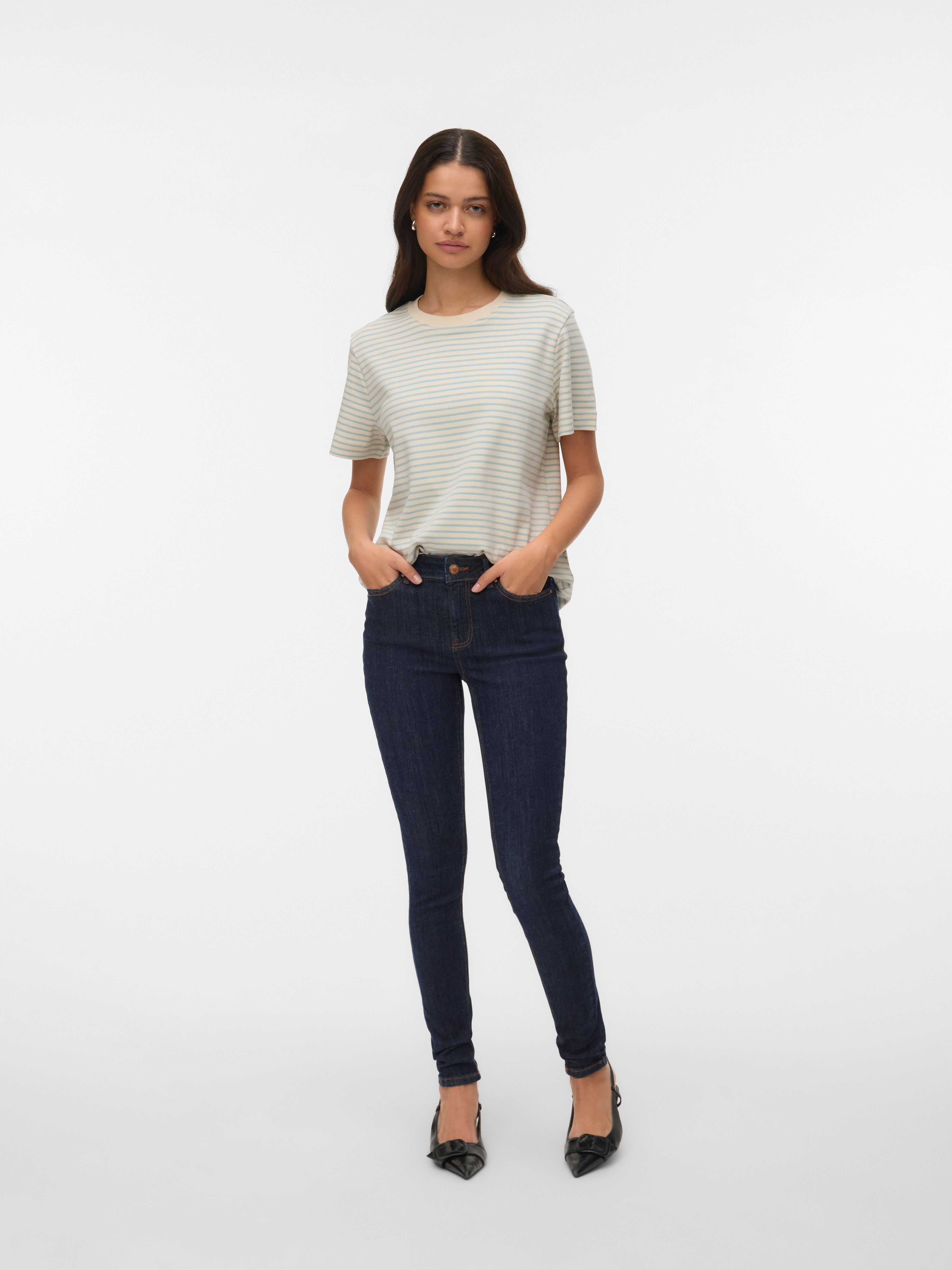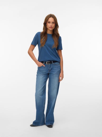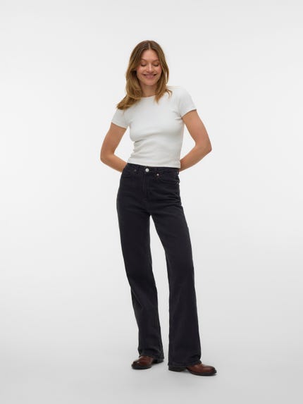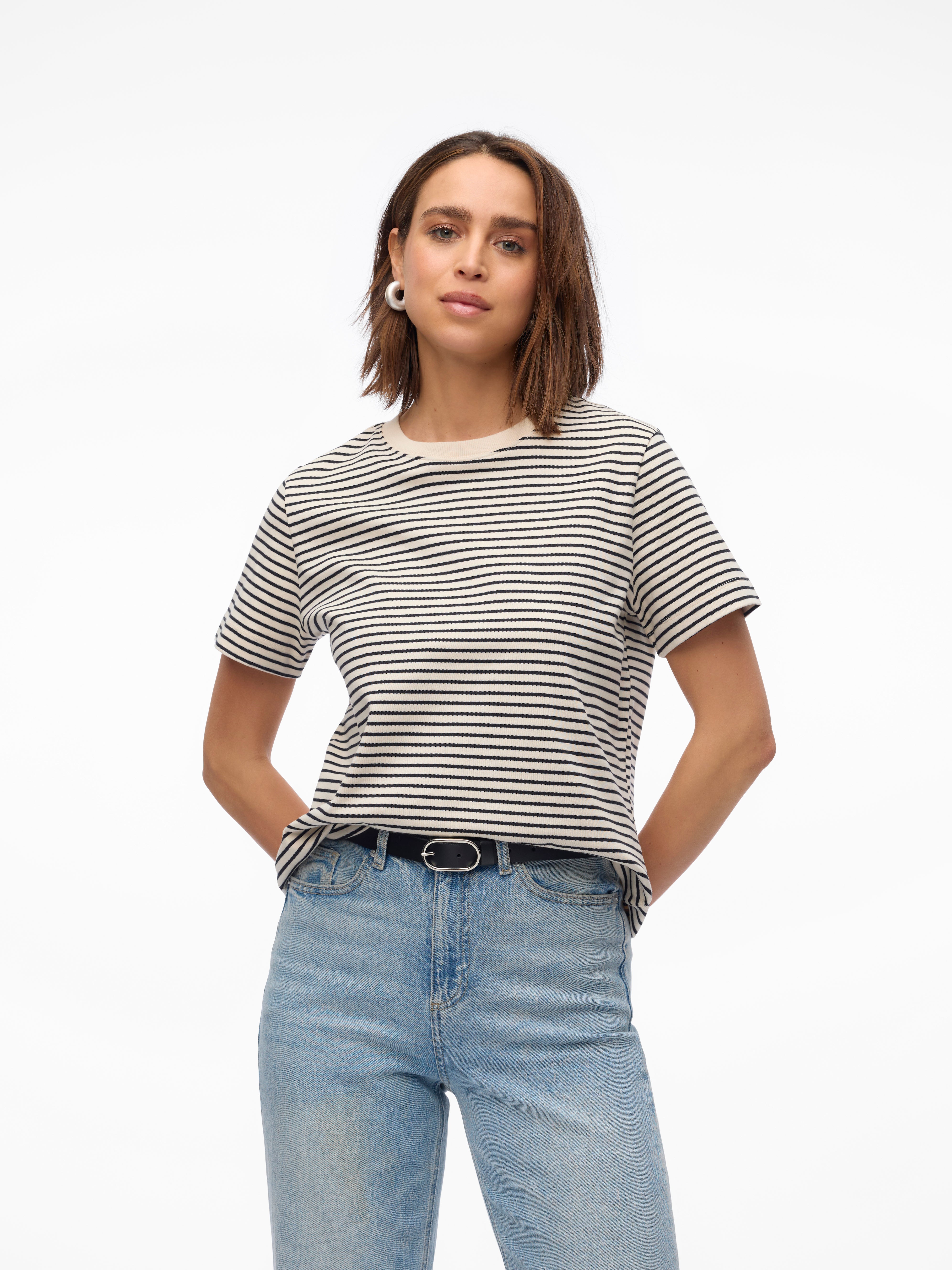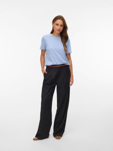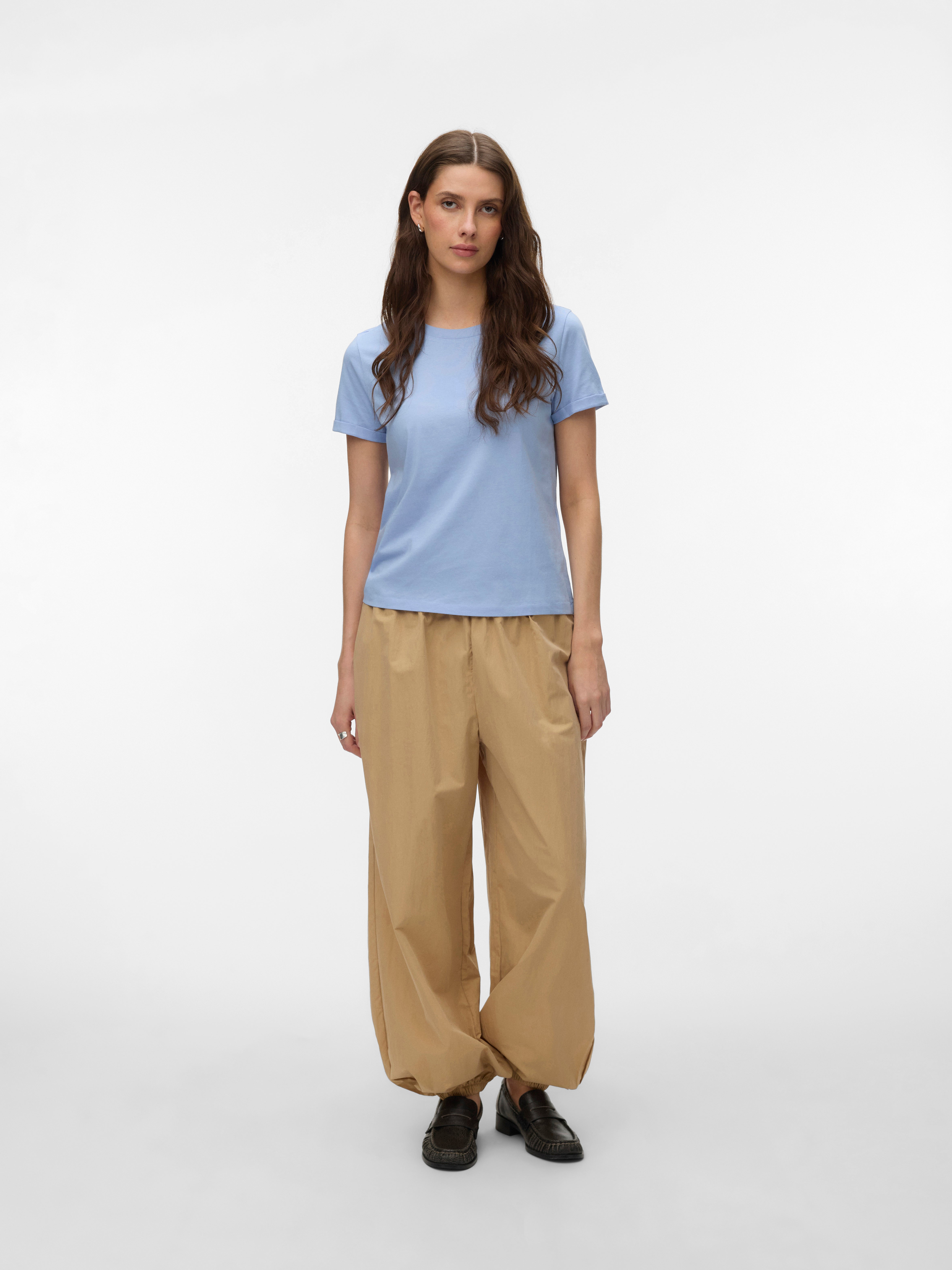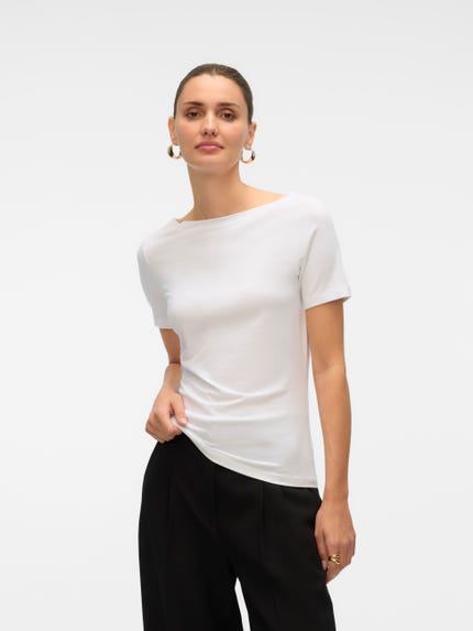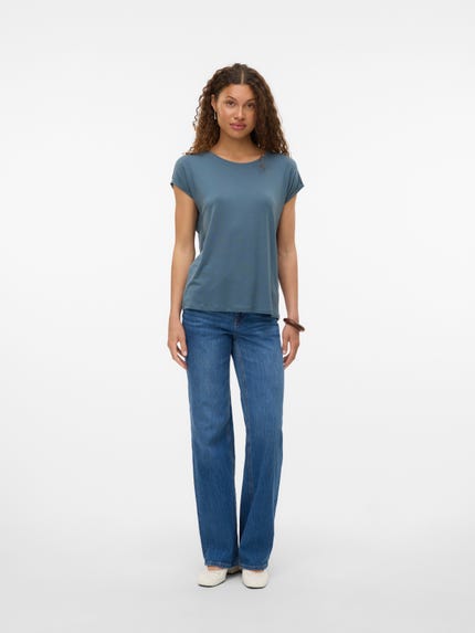 colour of the dress to get the most complete outfit. Black, white grey or navy? Or just one of each? Make sure you have the blouses and tops in all the colours you need to complete the rest of your wardrobe. Basic T-shirts are not only reserved as a snug layer underneath your beautiful dresses and a jackets but can easily be integrated as a part of your entire outfit. If you're looking for new items to upgrade your closet, check out our stylish collection of women's jumpsuits. Choose a classic, white T-shirt. A wardrobe winner that never goes out of style. Match it with a pair of jeans and a cardigan to achieve a perfect and casual everyday look. Looking for something appropriate for business? Then opt for a black T-shirt. Styled with a matching blazer and a pair of boots, this makes the ultimate, monochrome power suit. Basic tops are undoubtedly must have in women’s wardrobe so make sure you have all you need by shopping online at VERO MODA now.