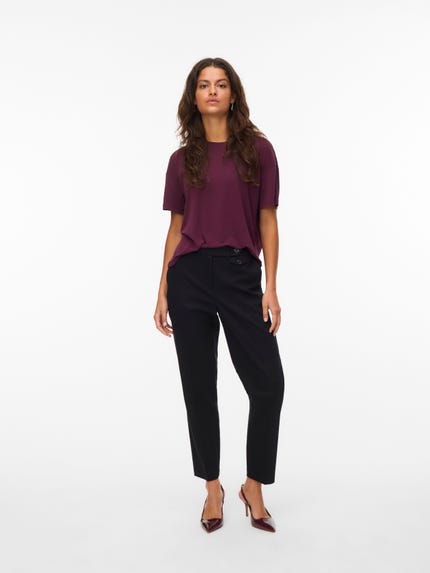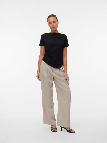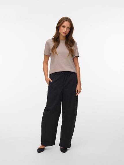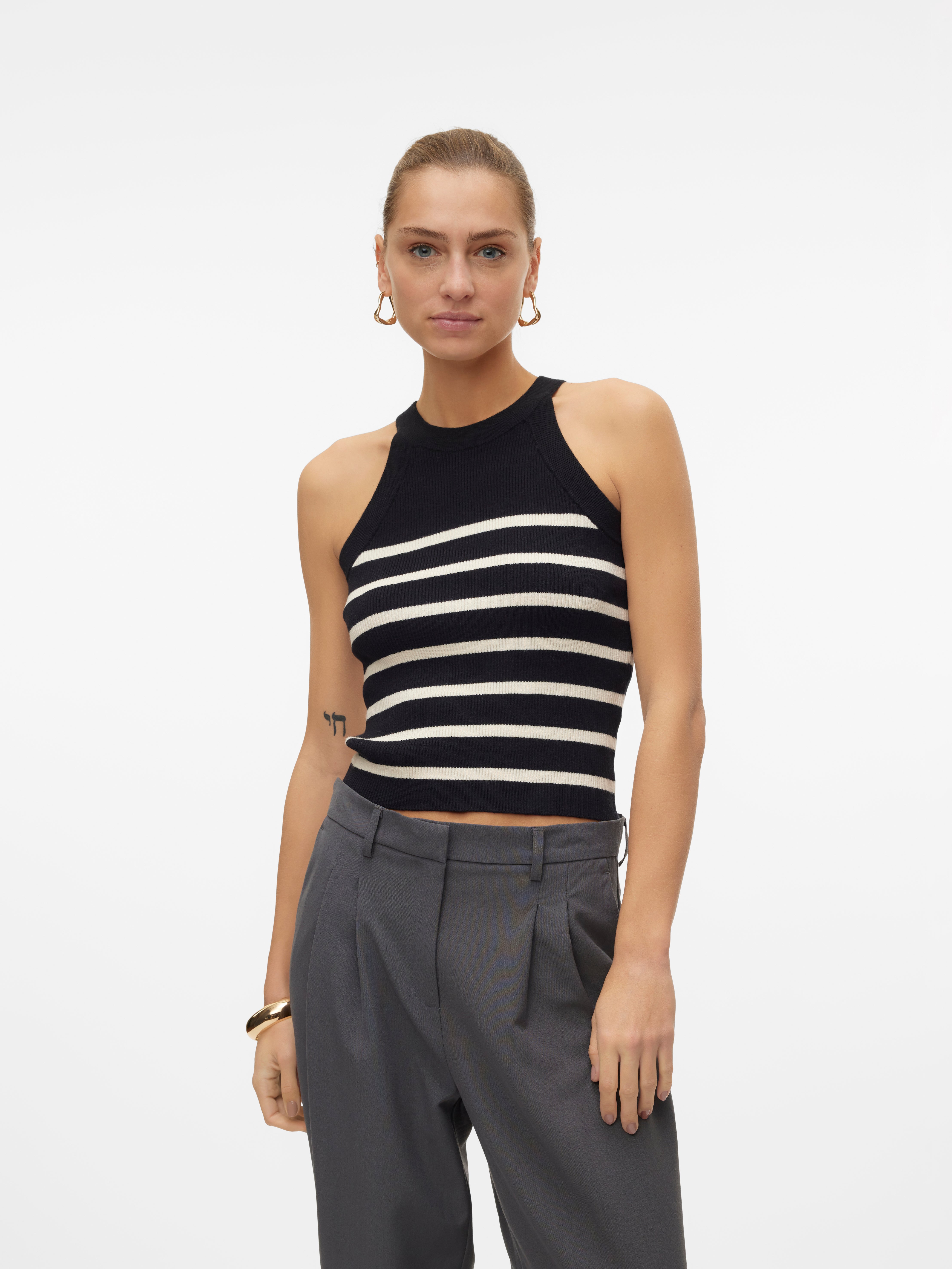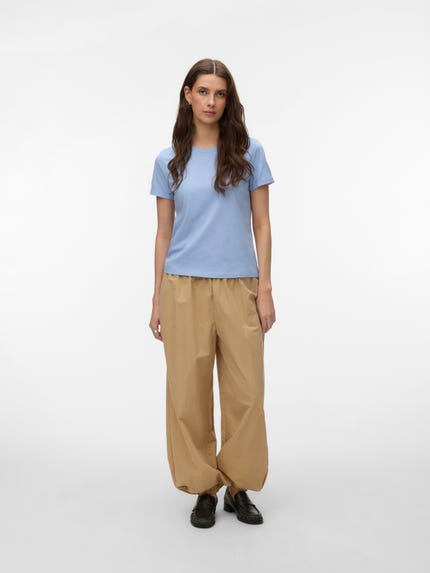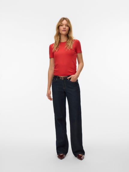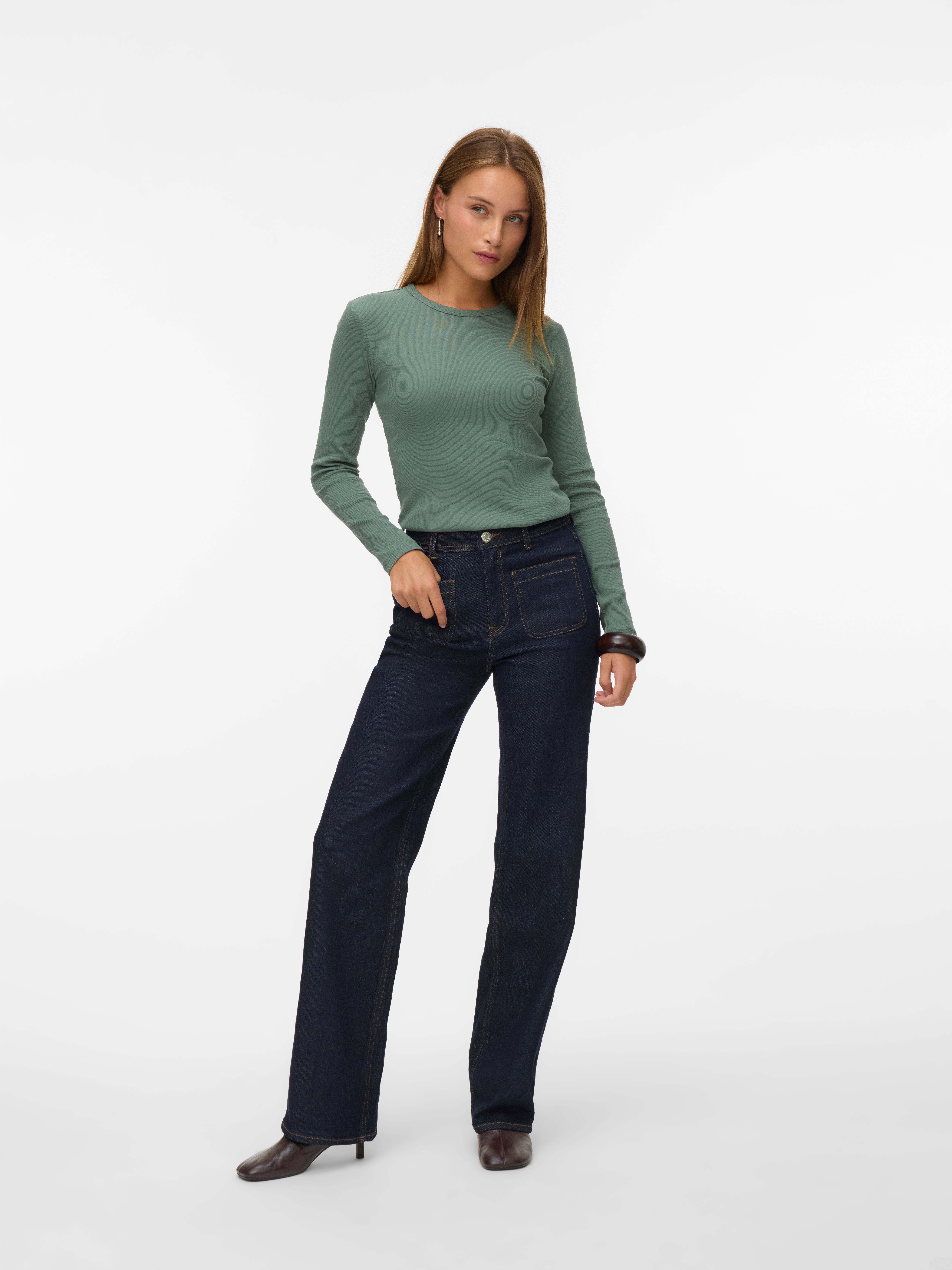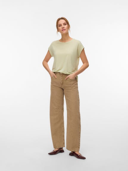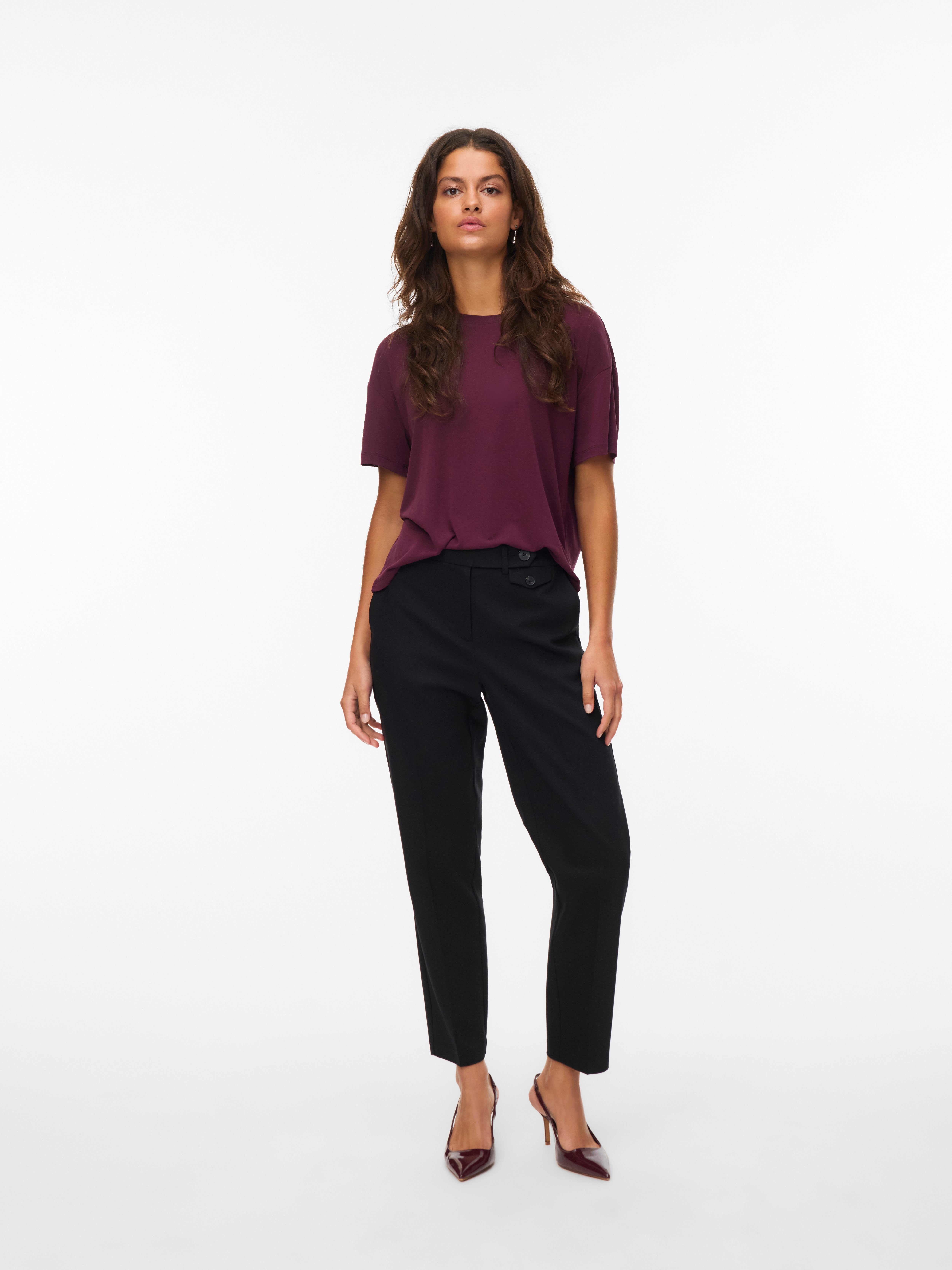 colour of the dress to get the most complete outfit. Black, white grey or navy? Or just one of each? Make sure you have the blouses and tops in all the colours you need to complete the rest of your wardrobe. Basic T-shirts are not only reserved as a snug layer underneath your beautiful dresses and a jackets but can easily be integrated as a part of your entire outfit. If you're looking for new items to upgrade your closet, check out our stylish collection of women's jumpsuits. Choose a classic, white T-shirt. A wardrobe winner that never goes out of style. Match it with a pair of jeans and a cardigan to achieve a perfect and casual everyday look. Looking for something appropriate for business? Then opt for a black T-shirt. Styled with a matching blazer and a pair of boots, this makes the ultimate, monochrome power suit. Basic tops are undoubtedly must have in women’s wardrobe so make sure you have all you need by shopping online at VERO MODA now.