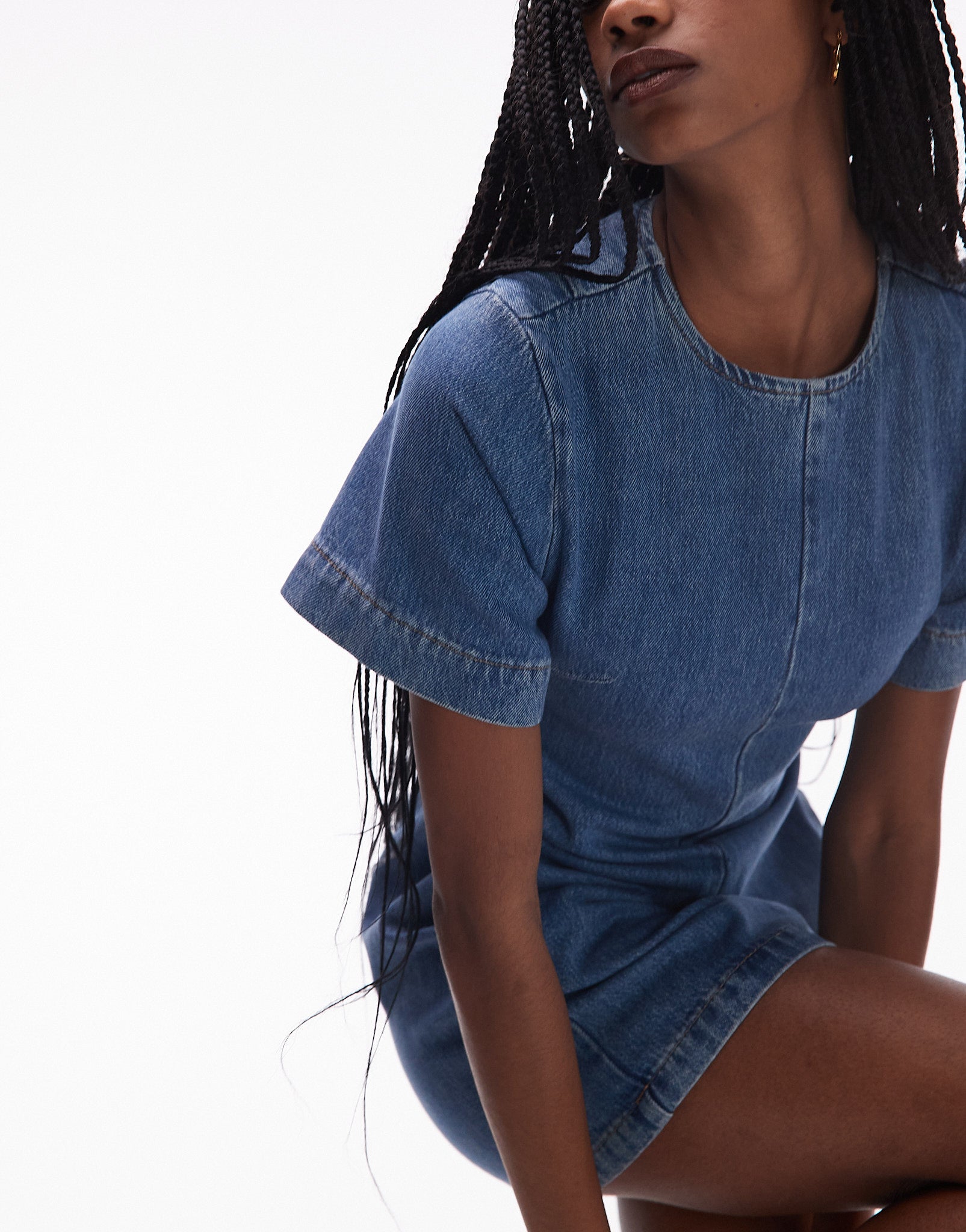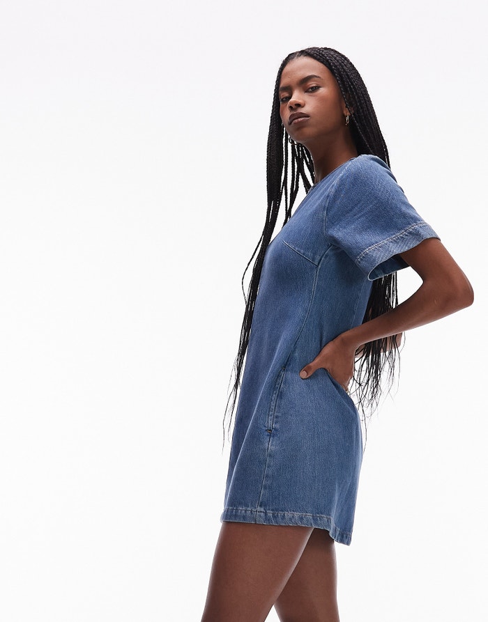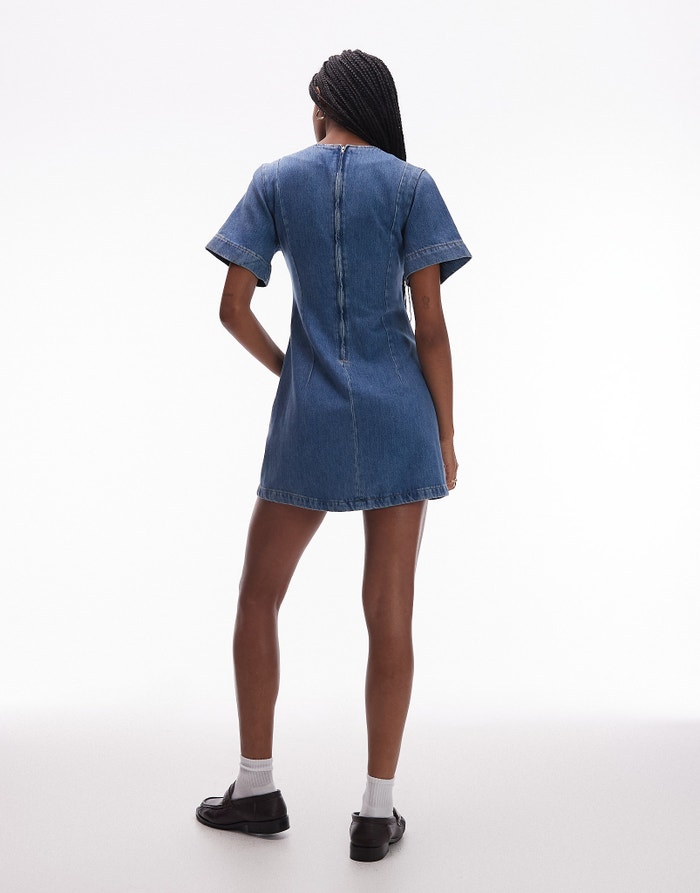Topshop denim short sleeved structured mini dress in mid blue - MBLUE